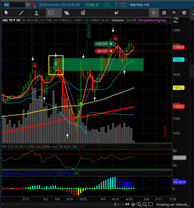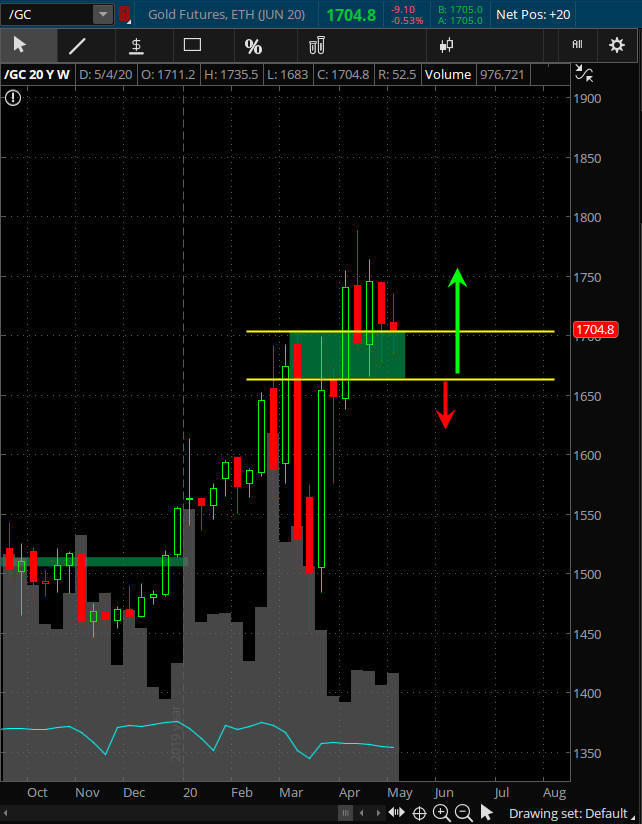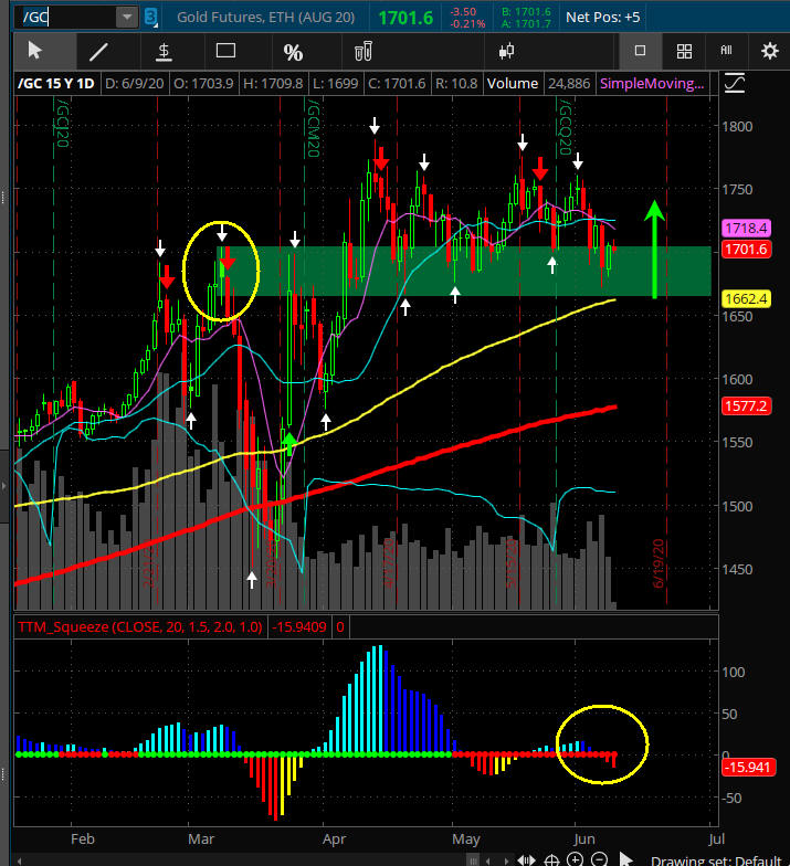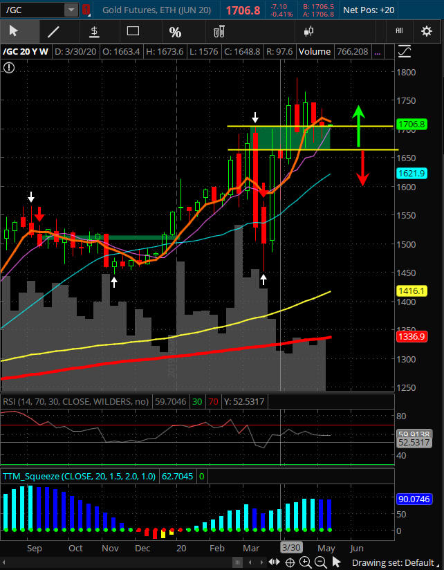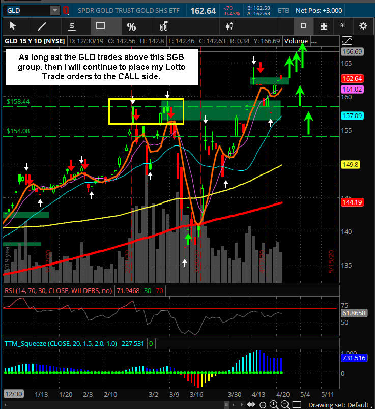 I am keeping my eye on the /GC Futures and will still keep my bullish bias so long as it trades above the daily chart SGB zone, If and when the futures should fall back under, I will still be buying wild card Lotto CALLS; because I believe that once 1750 is take out, the potential for a parabolic move is very high....especially if we suffer a large outbreak of infections and unfortunate deaths causing another shelter-in-place event.