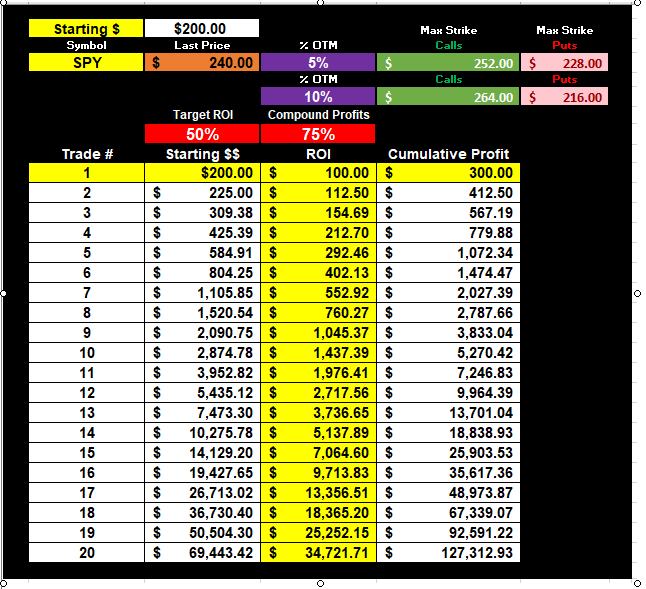 For example: If you were to start trading the SPY (or any stock for that matter) with $200; and go for a 50% ROI each trade; and then compound 75% of the profits; here is what the potential can be: