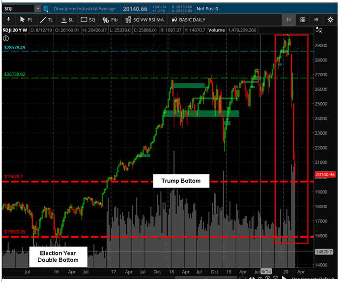 The $DJI is now trading at the Trump Bottom from his inauguration day, but the markets can still keep dropping even more, so do not get too confident we are anywhere near a bottom; because we are still in a very contested election year and the presidents political enemies would like nothing more than to see the markets drop even more and actually end the year UNDER 20K on the $DJI possibly ending his chances for re-election.