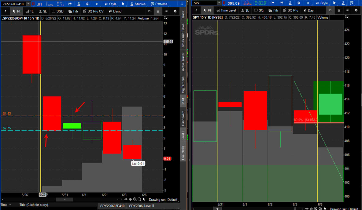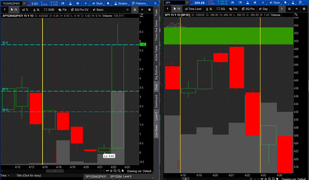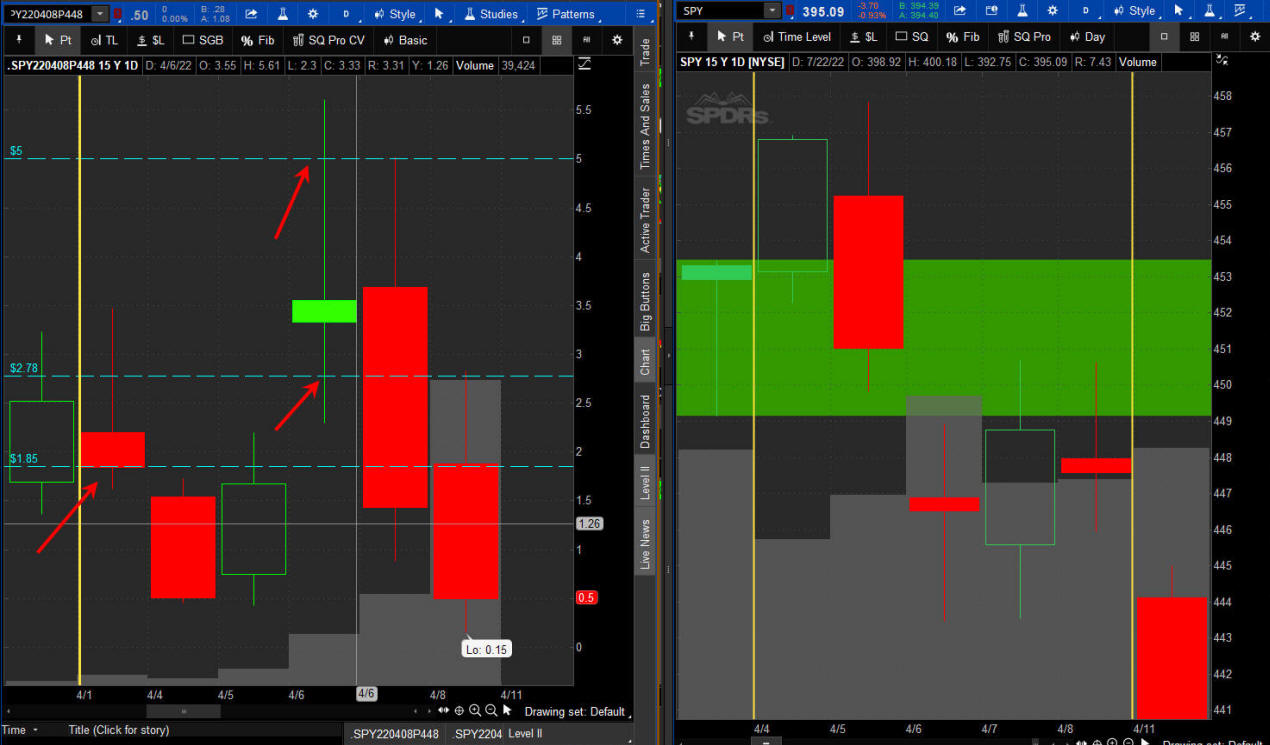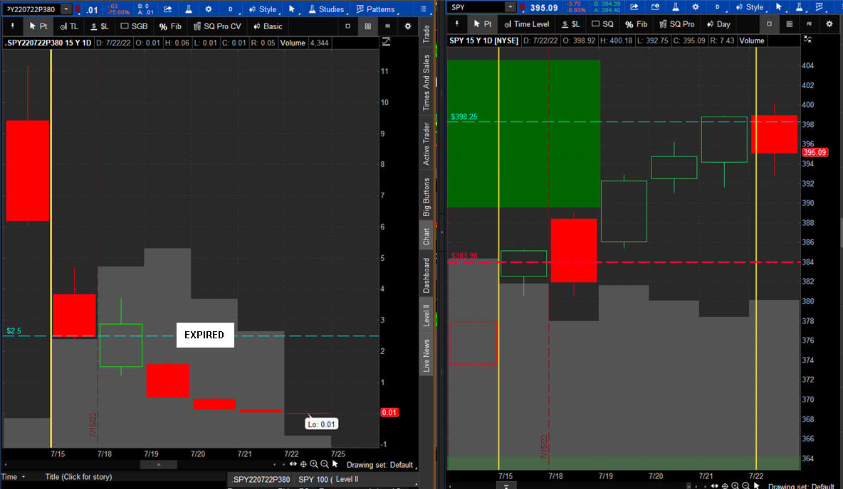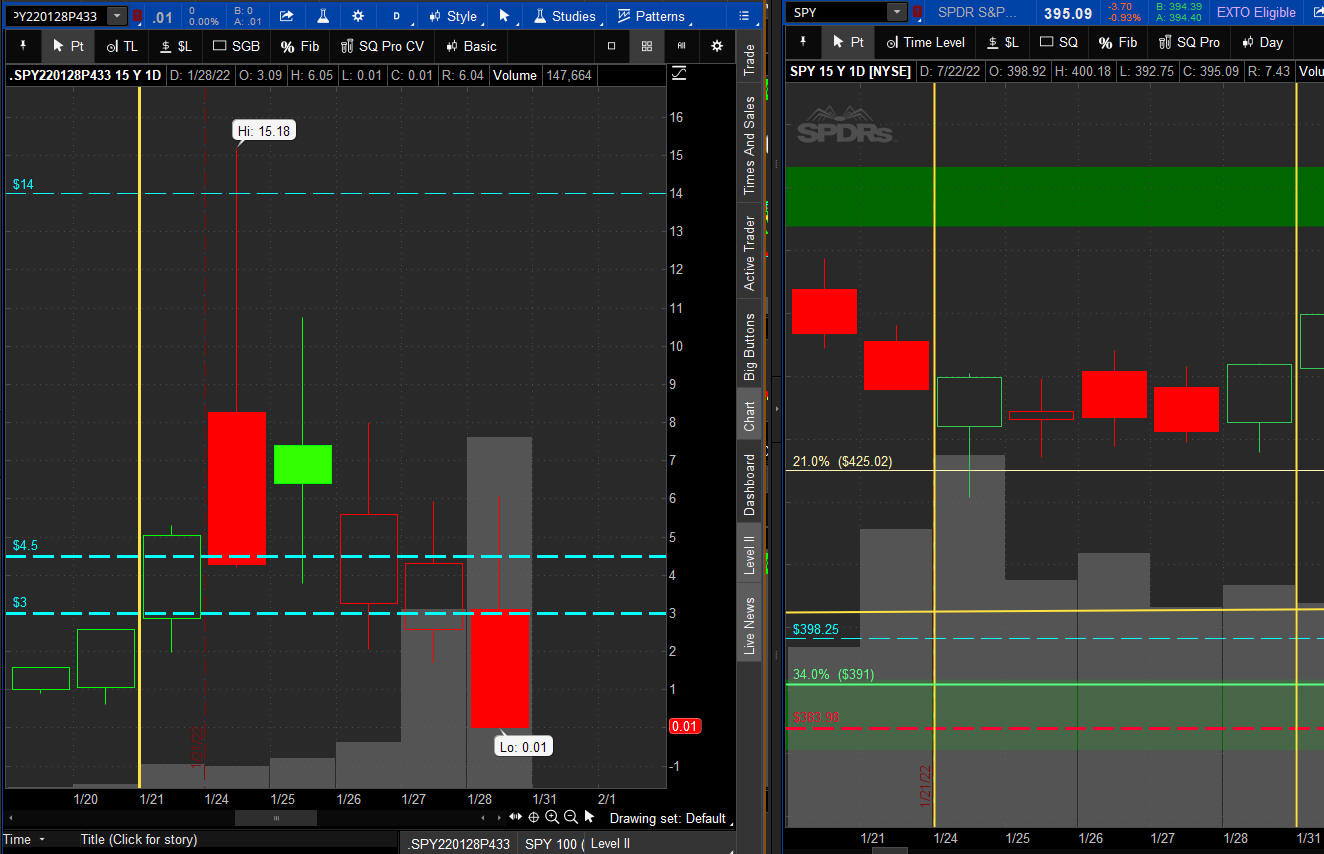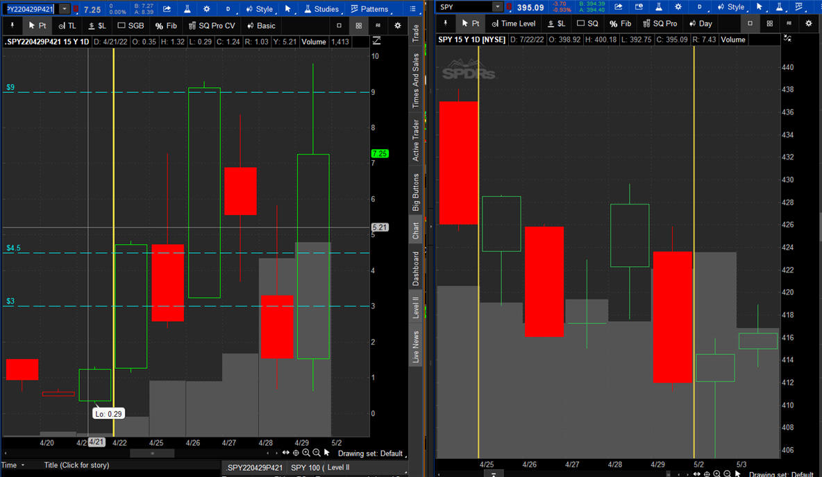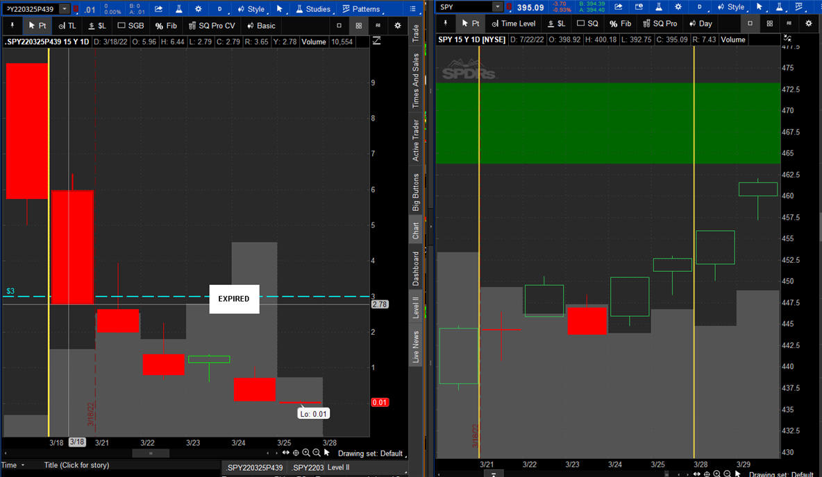 The left chart is the Option and the right chart is the SPY for the week.