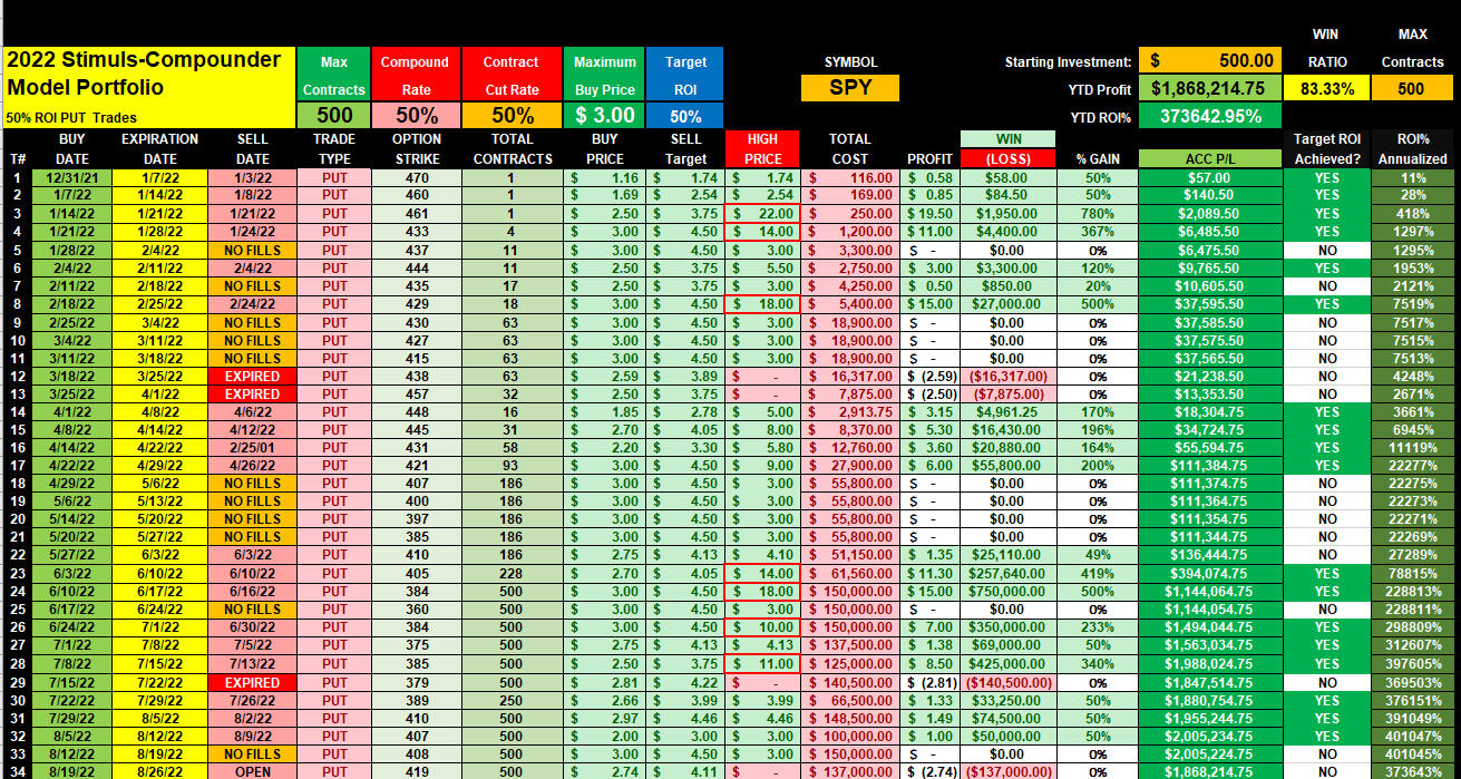 These are the charts for each weeks 50% ROI PUTS Stimulus-Compounder trades so you can see that the formula works and you could have been filled!