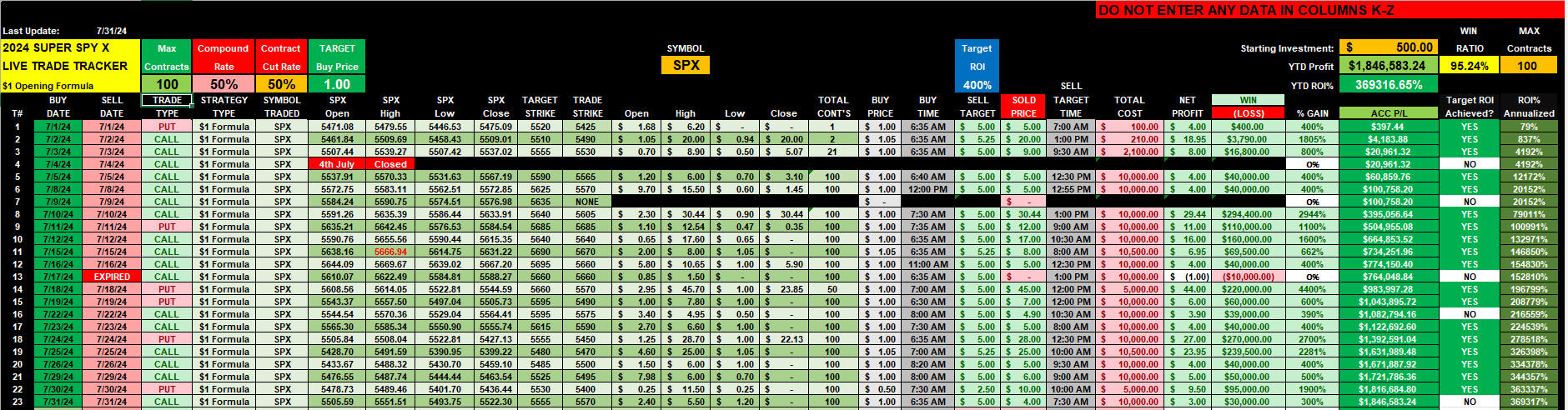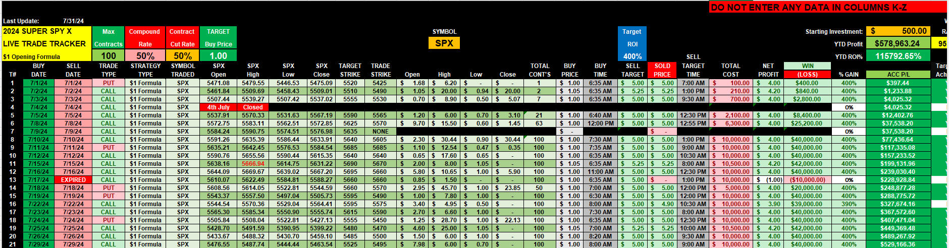 This spreadsheet is based on documented trade activity that fit the SuperSPY-SPX $1 Opening Formula strategy.