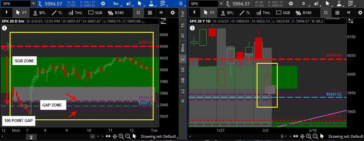 SPX made a 100 point gap down and continued into my "gap zones" then caught a bid and recovered EXACTLY to the top of my SGB zone!