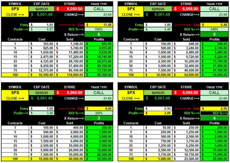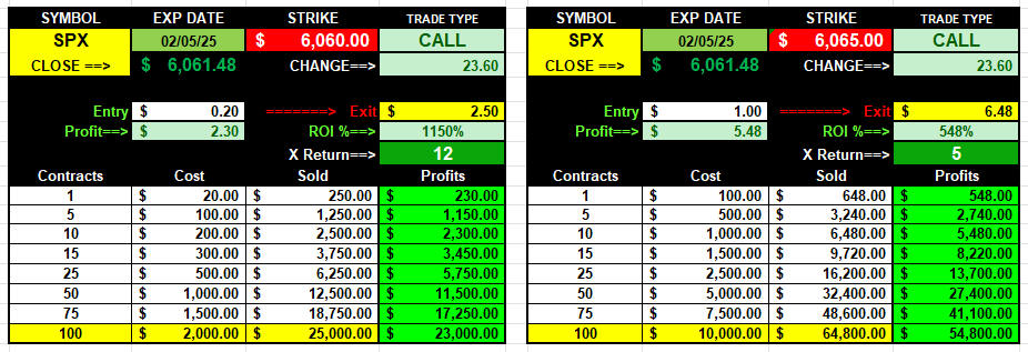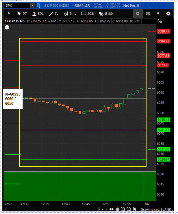 FEB - 5, 2025 SPX - OPEN - 6020.45 / HIGH - 6062.86 / LO - 6007.06 / CLOSE - 6061.48 — +23.60 Days Range 55.80