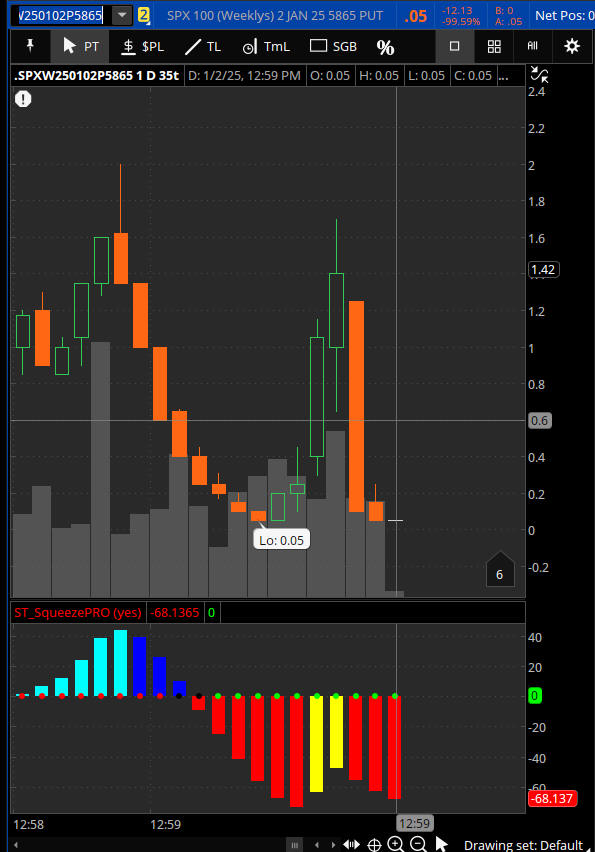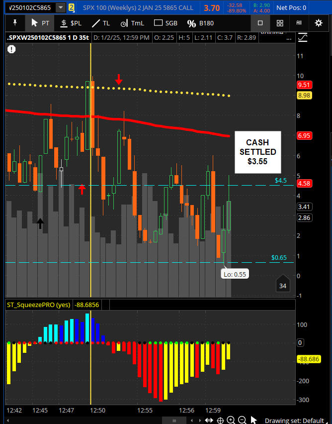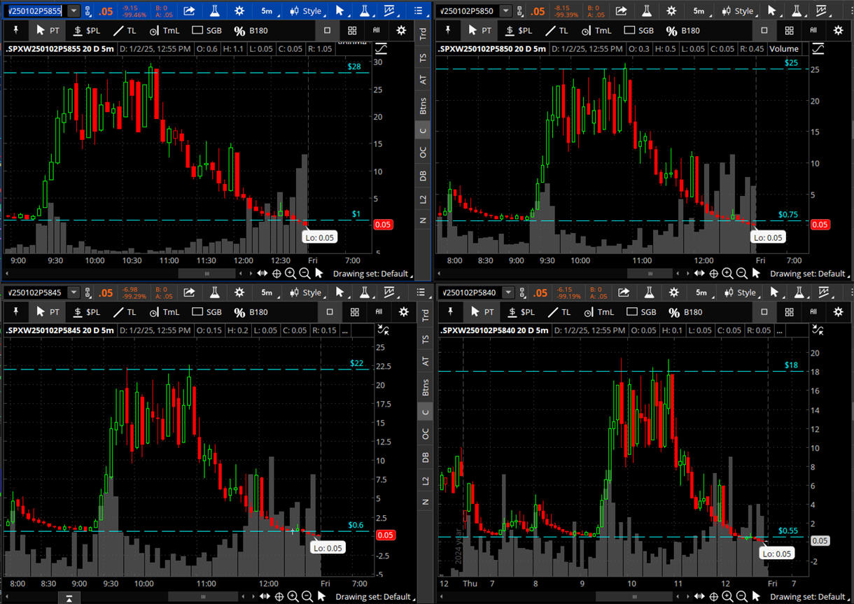 The 5865 PUT dropped to $0.05 and exploded over 30x in final minute then back to zero.