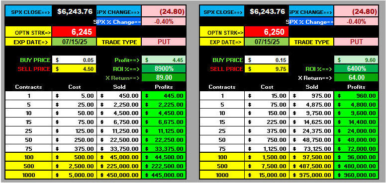 $1.00 Opening Formula Strike Ranges: CALLS 6345 / 6300 / PUTS 6245