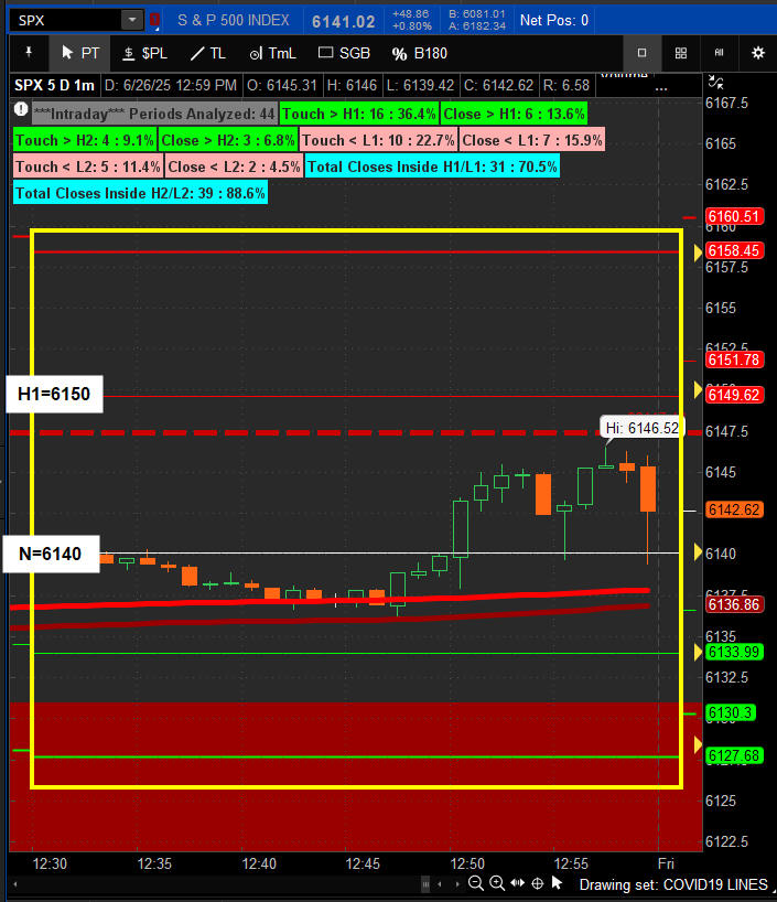 12:30 PM PST - Quant Pivot lines: Neutral =6140 H1=6150 - CLOSE - 6141.02 +48.86 +0.80% — Days Range: 39.25