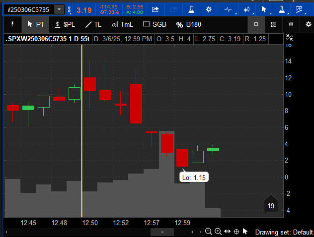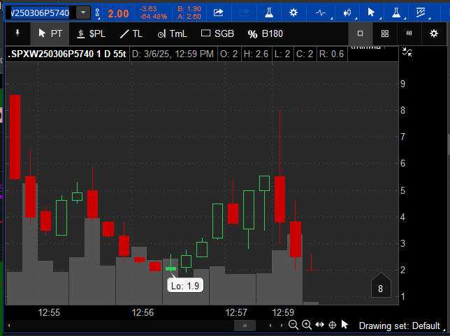 Today, the IV was sooo pumped up, the low on the QP Neutral strike only got down to $1.90, which is out of my max spend range of $0.65, but as you build profits, you can expand your universe of buy prices to catch trades like these.