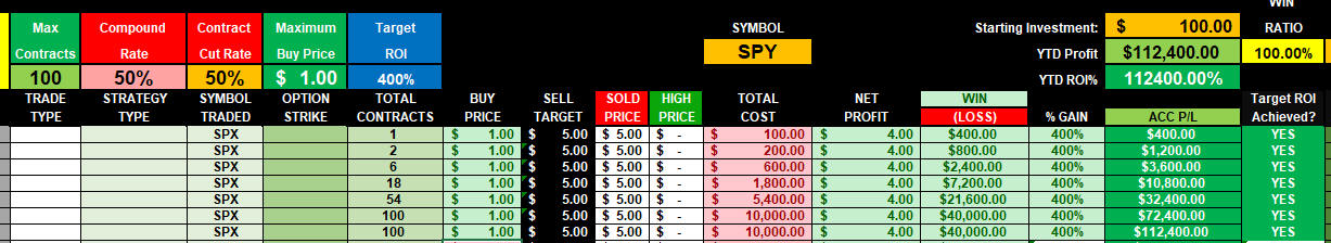 However, if you start with 1 contract and compound at a 50% rate, then target an average of 400% ROI, you can get to $100k in less than 2 weeks!