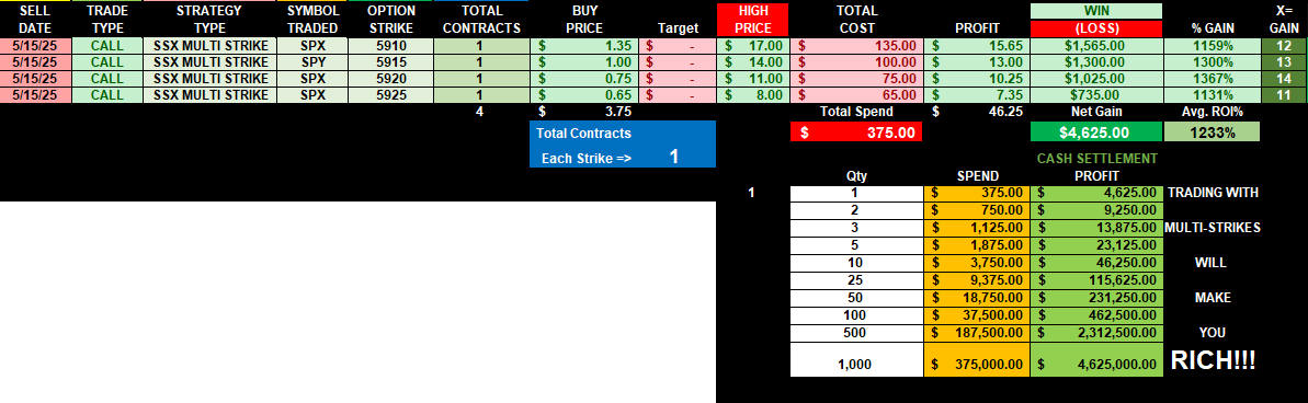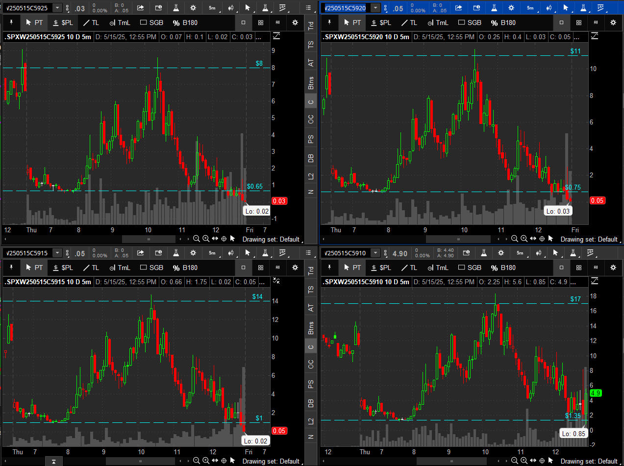 I traded the 5915 CALLS with a fishing order at $0.35 on both CALLS and PUTS and was whacked on both sides then a miracle close of $1.93 Cash Settlement on the CALLS!