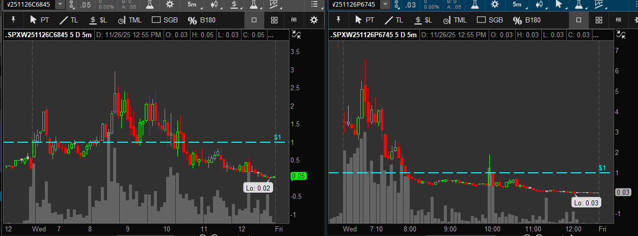 The SPX takes out the entire multi-day sell-week from the last SGB and holds over 6800 ahead of the Thanksgiving day Holiday. Tomorrow the markets will be closed and on Friday trading for only a half day. The $1 Formula was in a tight range only making a DoubleUP! but the EOD action was the Moby Dick opportunities when the SPX took a sharp profit taking dump in final 15 minutes of trading as news hit regarding a tragic ambush/murder of two national guard soldiers that happened near the White House.