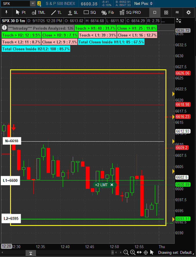 12:30 PM PST - Quant Pivot lines: Neutral =6610 L1=6660 L2=6595 — CLOSE - 6600.35 -6.41 -0.10%