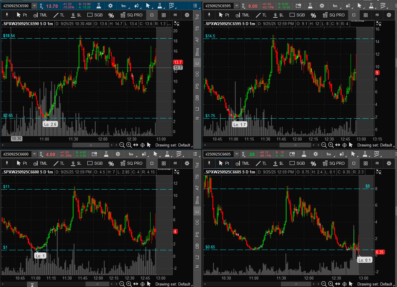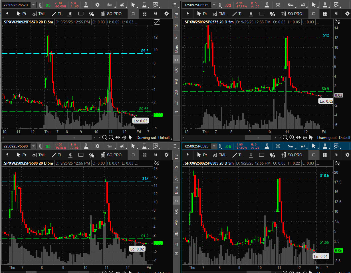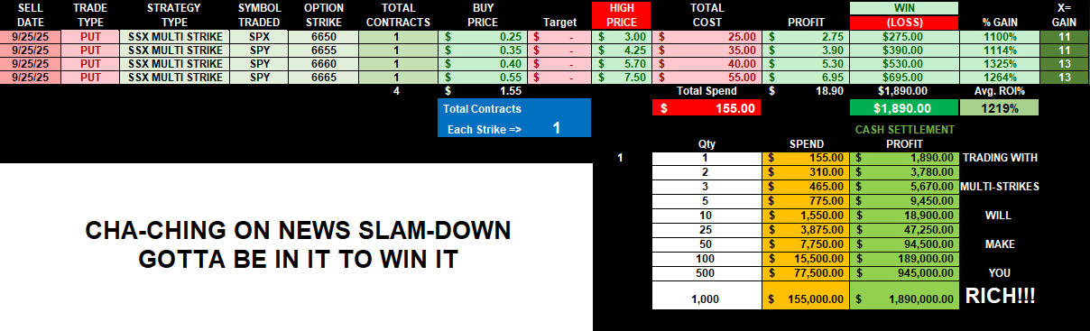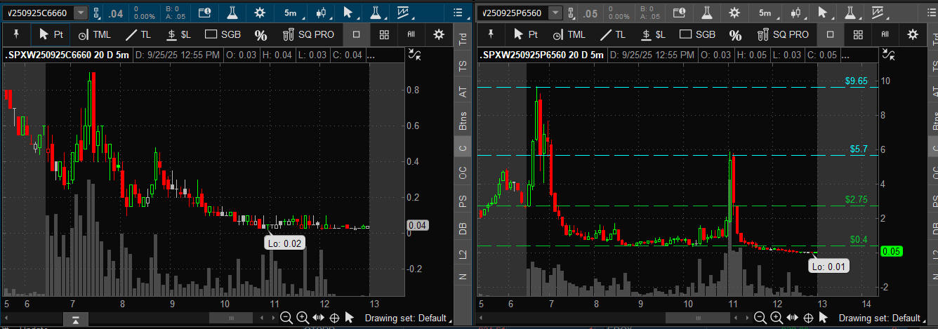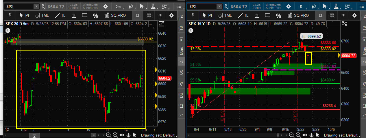So long as SPX remains under 6666.66 my bias is PUTS on rips and CALLS on 50 plus point dips with special attention to intraday V bottoms and daily SGB zones. The close today was another dragonfly Doji like the previous one basically exactly matching so there is definitely a BIG MOVE coming any day now. Next week is month/quarter end and then "crash" month October surprise begins so having event horizon PUTS in place at the SGB zones is where I will be and Spreads too.
