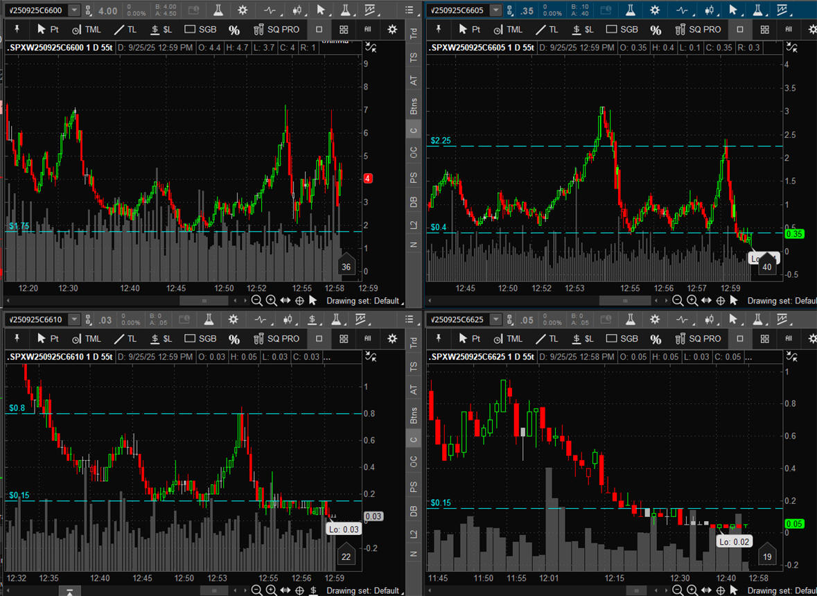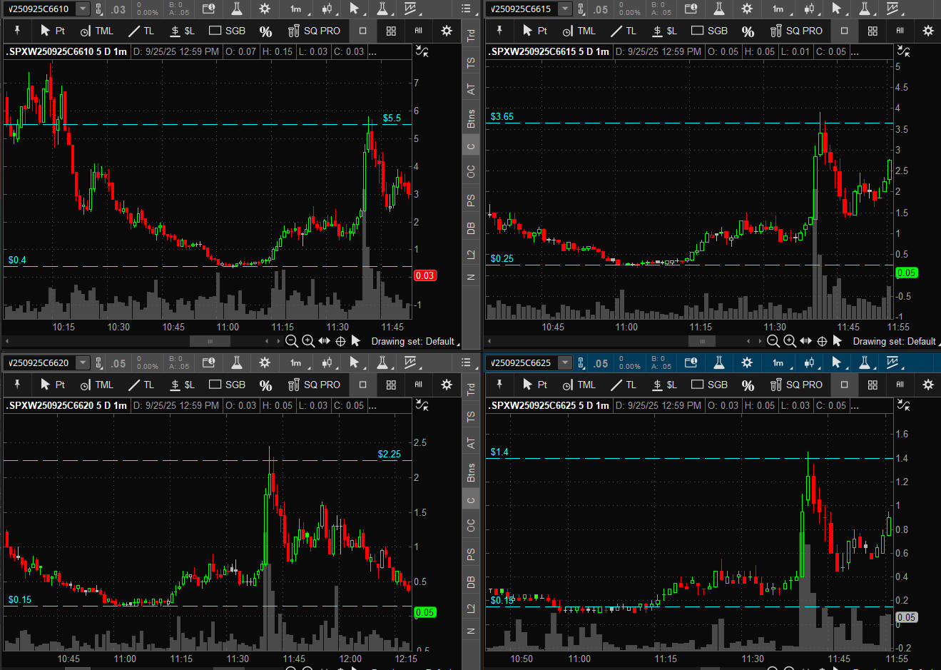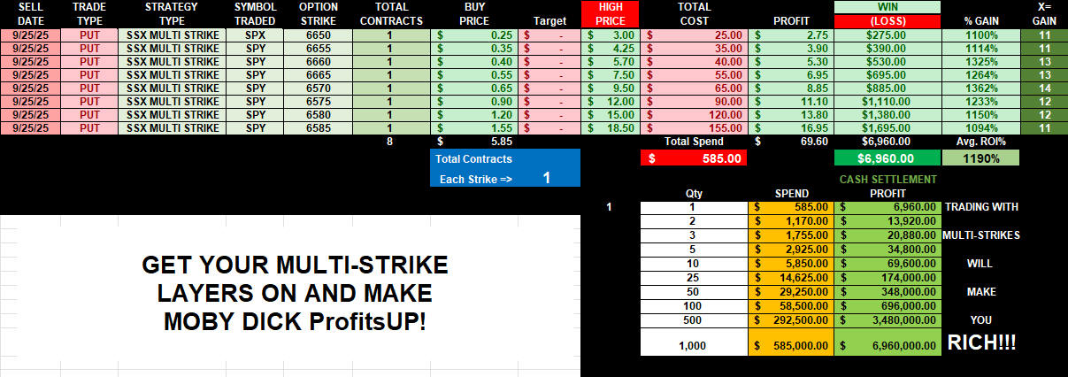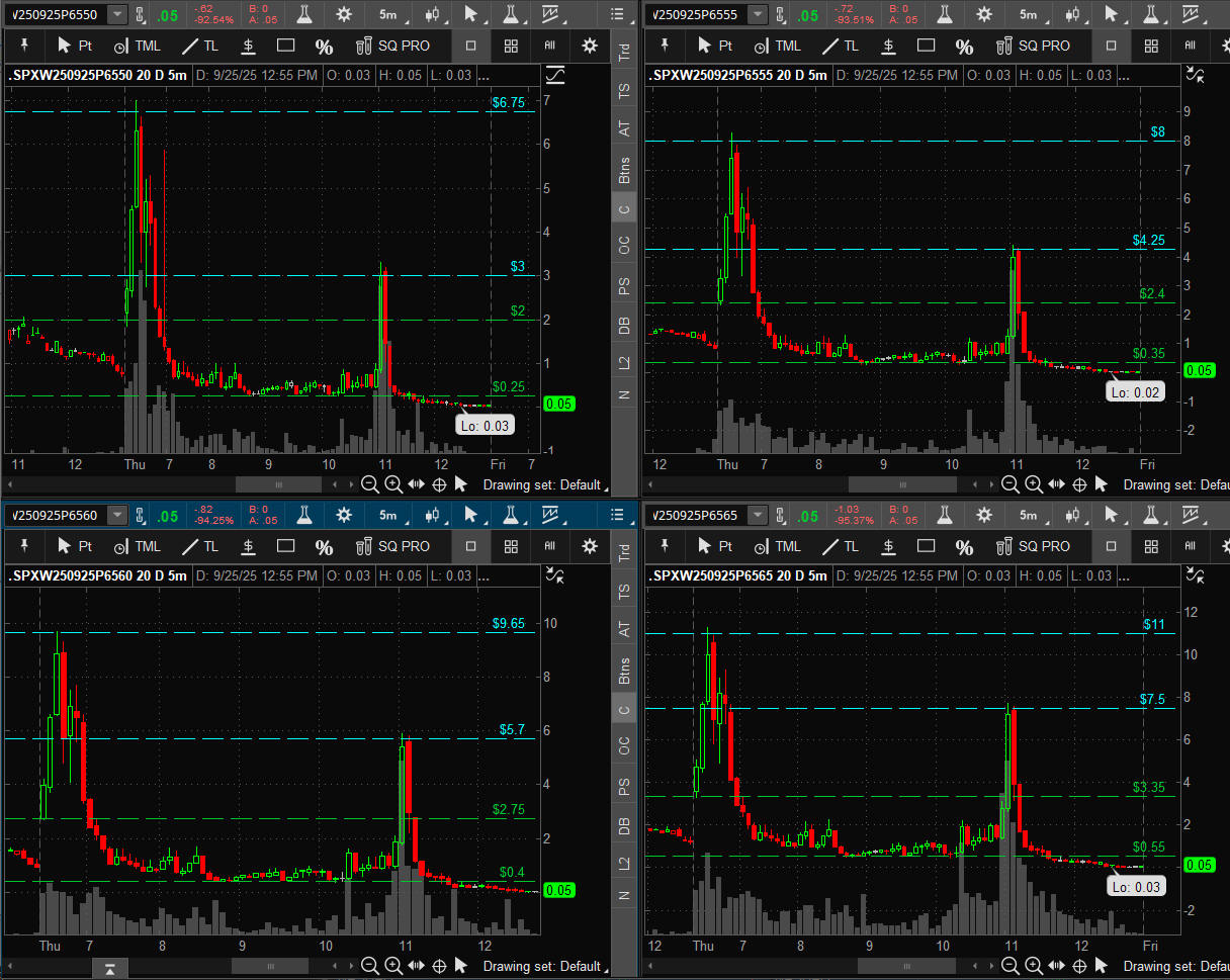 So long as SPX remains under 6666.66 my bias is PUTS on rips and CALLS on 50 plus point dips with special attention to intraday V bottoms and daily SGB zones. The close today was another dragonfly Doji like the previous one basically exactly matching so there is definitely a BIG MOVE coming any day now. Next week is month/quarter end and then "crash" month October surprise begins so having event horizon PUTS in place at the SGB zones is where I will be and Spreads too.