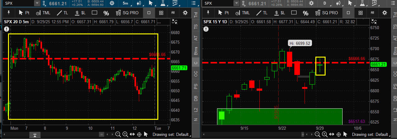 OPEN - 6661.58 / HI - 6677.31 / LO - 6544.49 / CLOSE - 6661.21 (666 / fibonacci) +17.51 0.26% — Days Range: 32.82