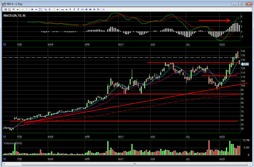 It was a month end sell off adding to a week of overall selling and NFLX could not keep the love on this stock going, and when it failed to take out yesterday's high, I went short he puts—and almost have my 20% move to boot!