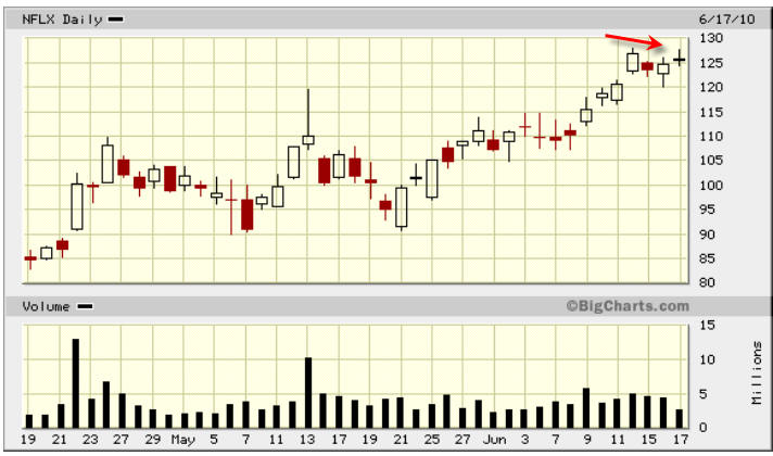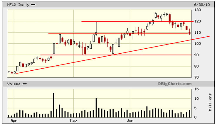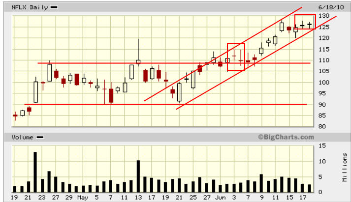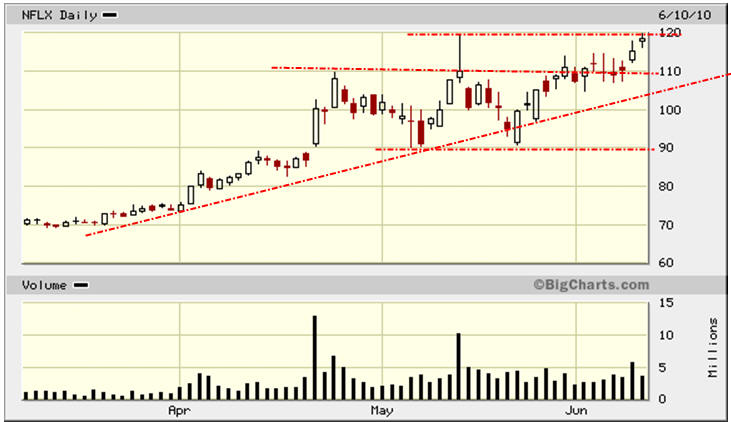 6/23/10 - Not much action today but another DOJI formed off the tops of the last ones. This could be the break I am looking for and if NFLX falls below $115 there will be some heavy selling pressure start up in my estimation.