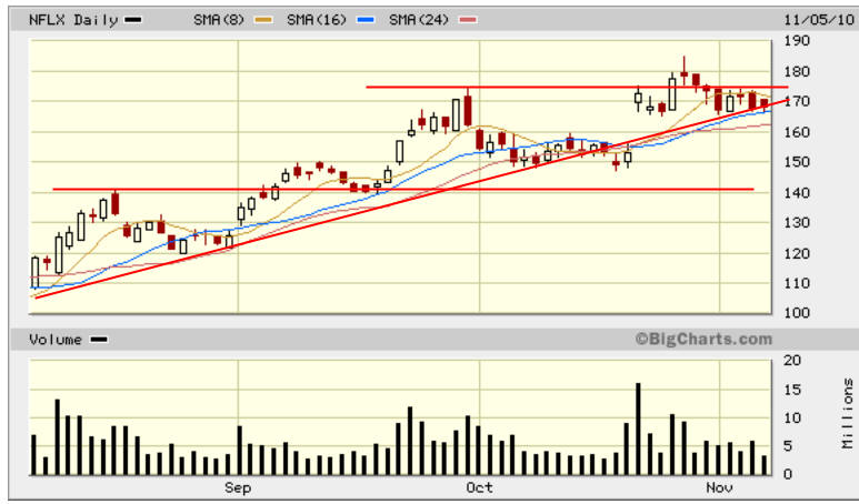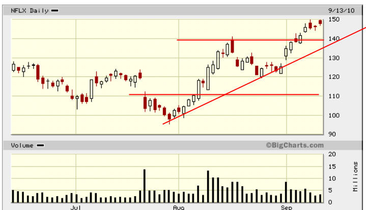The next play for the compounder series will be on Netflix. This stock has been running like the wind since the monster gap up back in Feb 2010, and it looks like the party is finally coming to a short term end. I really like this company (I'm a subscriber) and they have done some great things with their business model. Their tenacity with direct and internet marketing has made them a house-full name with consumers. They even have the love of DVD/Blu-ray manufactures who co-brand with them on their equipment offerings. Their major competition, Block Buster and Hollywood Video are almost out of business, and aside from a little competition from Kiosk vendors such as Red Box, they are still the kings of the hill in on demand/rental entertainment with close to 14 million subscribers. Eventually, I think the big cable companies will put the heat on in a very big way when they ramp up video-on-demand programming, but for now, this stock has the love of the investing public. What drives this stocks price is subscribers and unless NFLX keeps packing them on, the stock will take a sharp hit to the share price—and there is a lot of room to drop on this one.
