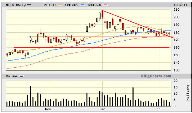 1/7/11 - New year and NFLX is lagging with the market. Looking like it may make another attempt at the all time high since the bap from Nov is holding up; however, I am not a total fan of continued upside as competition continues to come on line. I even cancelled my subscription today because I am just movie burned out and they raised my rates to offset continued bandwidth demands with the online viewing. There are more and more movies coming on line to watch so we will have to see in the next earnings report if the price increase helped or hurt subscriptions. I can assure you that when subscriptions suffer this stock will pay us off with puts!!!