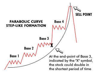 The Parabolic Curve is probably one of the most highly prized and sought after pattern. This pattern can yield you the biggest and quickest return in the shortest possible time. Generally you will find a few of these patterns at or near the end of a major market advance. The pattern is the end result of multiple base formation breaks.