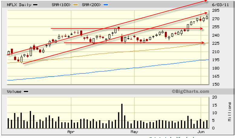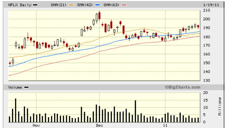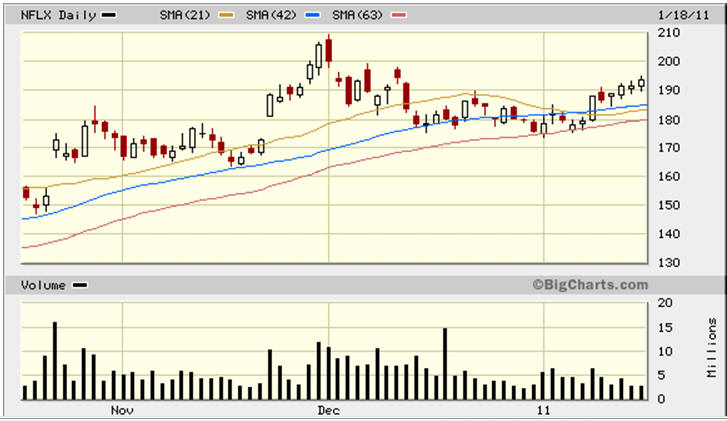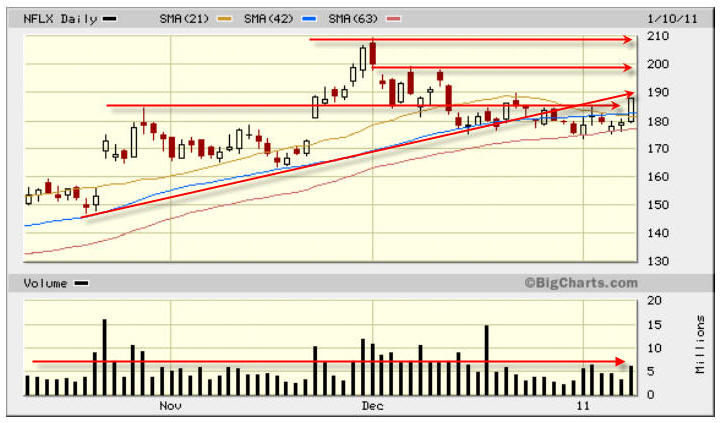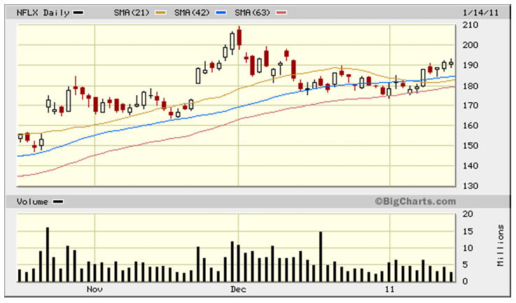1/10/11 - Today the lagging stopped and NFLX put on some nice gains. There was a bullish report from Goldman Sachs analyst Ingrid Chung most likely giving fuel to the fire today.