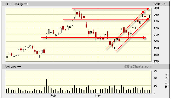 ====================================================================================== 3/31/11 - NFLX still hanging tough with three Doji daily candles in a row. The last time I saw this the stock shot up quite a bit so the big question of the day is will it do this again? The catalyst this time around is upcoming earnings but looking at the past couple of weeks worth of trading one could make an argument that the price action has been booked in and we are in wait and see mode. Tomorrow is Friday, so most likely there will be jockeying for positions more than upside improvement in my opinion.