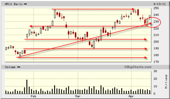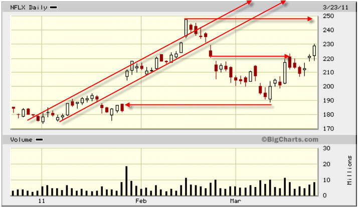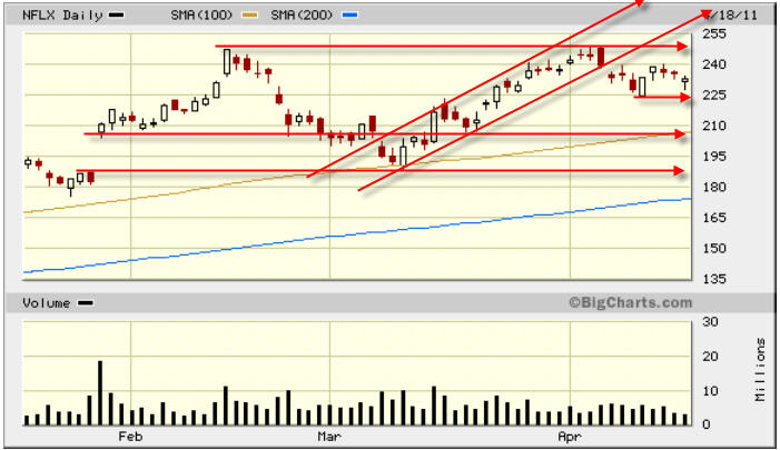 1-14-11 - NFLX had a staggering week but finished up overall. With earnings coming and the market holding ground, I anticipate NFLX will start to push higher with buyer enthusiasm heading into earnings. The week of earnings release, I will pick up DOTM puts and calls for a Lotto Play potential.