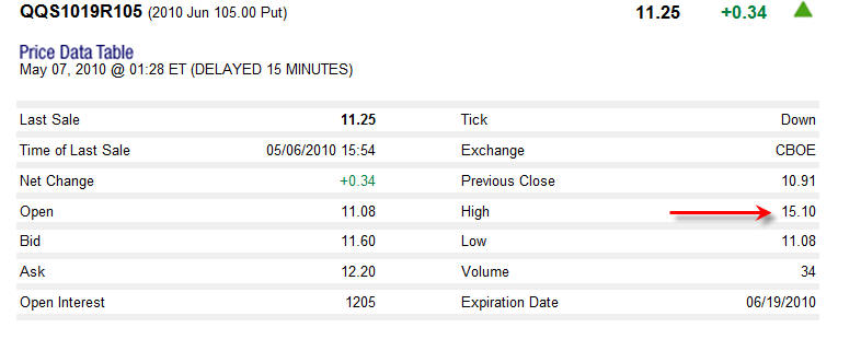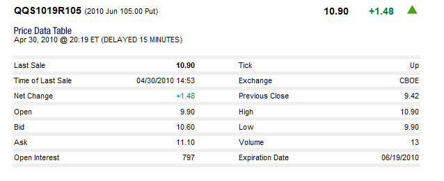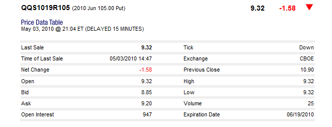 5/22/10 - Second day of selling and this time market support too. Not much action in the put price so we have to see even more follow through this week to have a crack at a 50% overall stop loss. The target is those DOJI patterns at $110.00