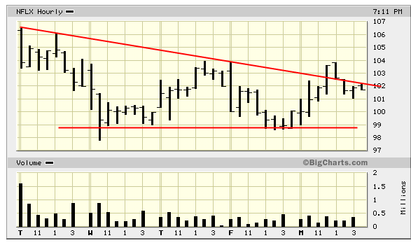 As I suspected, NFLX pulled out of the downturn and headed back over $100 today on above average volume. I did not initiate the play yet because I want to see it fail to hold the $100 area. In after hours the stock continued to edge higher so we will see what tomorrow brings. One thing for sure, our $105 puts are getting cheaper!