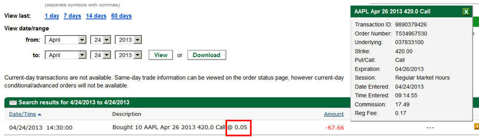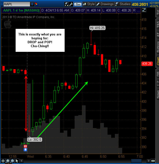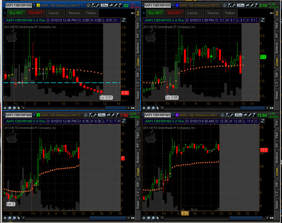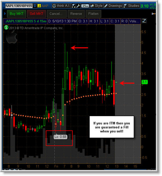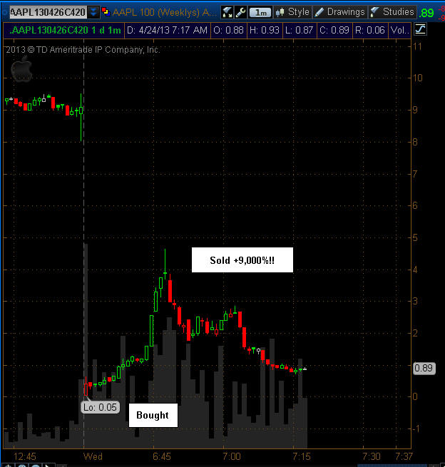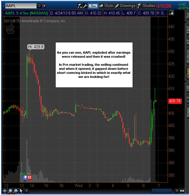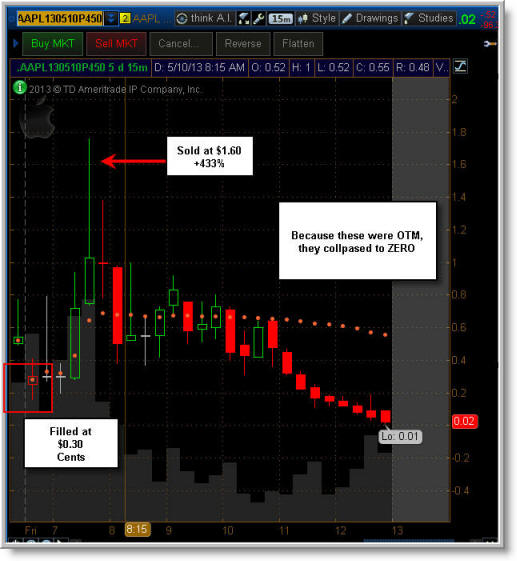 If you are going for Puts, then you want the stock to gap up and start to sell off immediately—Puts are the best for getting the biggest winners as stocks typically fall farther and faster than they go up. Making profits with this strategy is an art form. If you want to "swing for the fence" take some profits off the table in the first 5 - 15 minutes and let the rest ride. I have found that if you get big profits early in the trading session, TAKE IT, because too many times I have had a nice profit early on only to see it crushed in the afternoon session (especially if I am OTM), but if the stock does not go your way until the afternoon session, then you are more likely to see it push right on through to the expected price target and you can make the biggest profits. Still, you should consider taking 50-75% off when you have an early profit and letting the rest ride into the close—just be sure to sell before the bell even if you are ITM to avoid assignment and extra commission costs. Here is a trade I did on AAPL 5/13/13