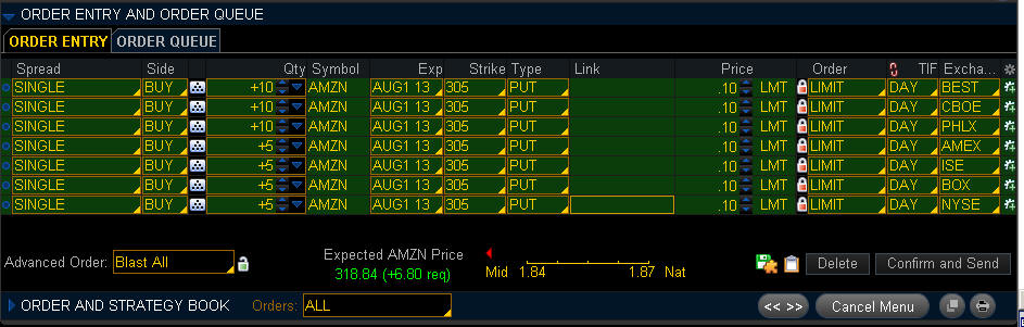 NOTE: TOS has, what they call, their "BEST" route, which allegedly gets you a faster and better fill or price. In my experience, this is NOT the case when you want to buy more than 50+ contracts. Every time I try to buy 50 - 100 at $0.10 or less using their "BEST" route, I typically get filled on a few contracts and then ALL the market makers ASK prices go higher; however, when I divide up my contracts and "BLAST" to all the Market Makers, then I get filled on everything most of the time. If you plan on buying a lot of contracts, then you should consider placing orders at staggered entry prices and contract size, but if you have a small account, then fish for entry prices under $0.50 cents until you build up your trading account—you will miss a lot of winning WW trades, but be patient, with 500%-8,000% ROI on the smaller entry prices, it will not take much time until you can fish for all the strikes and entry prices!