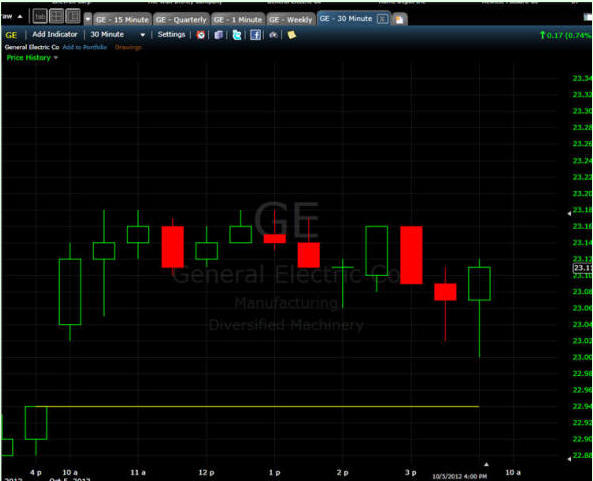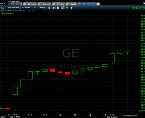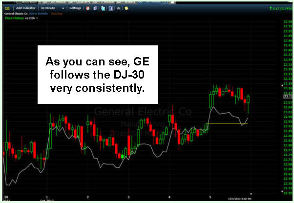 Here is a weeks worth of trading on GE with a DJ30 comparison line: