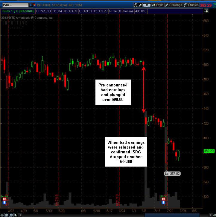 When these types of stocks do not get the expected outcome, they will fall hard and fast giving our cheap PUT options very large swings in price making us MEGA LOTTO MONEY! The key is having the capital to consistently lay your nets so these White Whales find you! Here are more examples of stocks that were crushed after earnings: CMG Missed