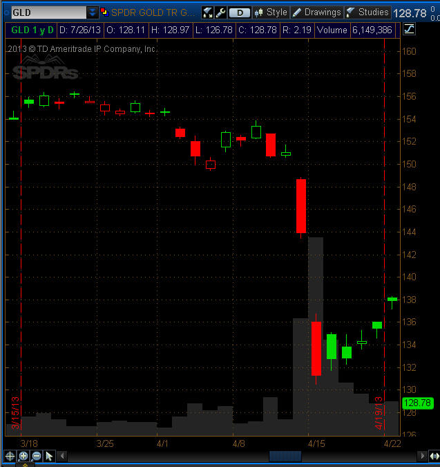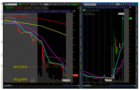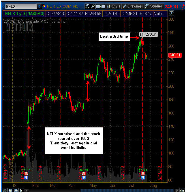 Now very few trades work out as well as this one did, so you have to decide how much risk capital you want to spend until you connect with one of these trades, then you can start building your way up to 100 contracts. I want to be clear that most of these trades will expire worthless, so you need to have a strong cash flow or day trading plan as outlined in this training series so you can keep fishing until you catch one—and you will catch several in a years time! With thousands of percent in returns, it does not take too many winners to pay for all your losing trades. You only need a couple big winners and your trading account will get very fat with cash to keep fishing. The best part of this strategy is when you do start making profits, you can scale up your contract size to the point when you want to be able to buy 100 or more contracts. NOTE: Buying more than 20-100 contracts OTM can create a challenge when you want to sell unless the options strike you are selling has a substantial amount of volume, so I stack my orders in lots of 10 contracts ahead at a price I think it will get to. That way if the stock starts to build momentum, the options will spike up and novice investors will buy with market orders. If you are already in line with offers, then you will be first out as the computers will match your offers on the way up. If you are ITM when you want to sell, and you cannot get a fill, you can always exercise and sell the stock. This does create slippage scenarios and increased costs, but hey, if you have 100 contracts (which means you control 10,000 shares) then you can afford a little slippage if it comes to that—pigs get fat...hogs get slaughtered! I prefer to do these trades during earnings season, especially when they are reporting within a couple of days of expiration— the volatility will make your profits massive! Here are some examples of stocks that were either crushed or explode over earnings reports: 4/12/13 GOLD CRUSHED