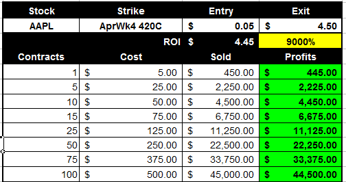 This was an actual trade I did on AAPL. I had a standing order in for 10 contracts at $0.20 cents, and when the market opened, I was instantly filled for $0.05 cents!!