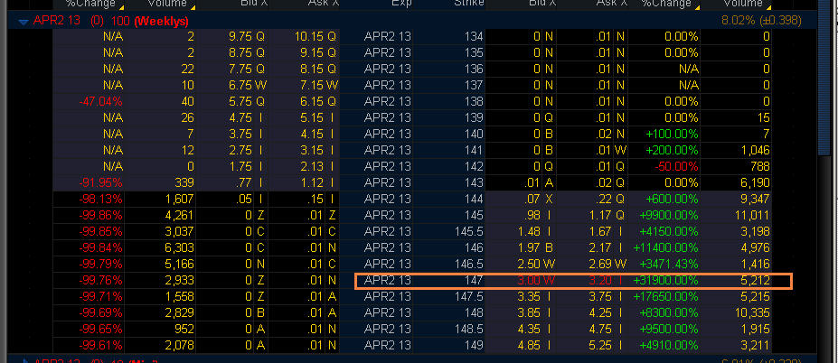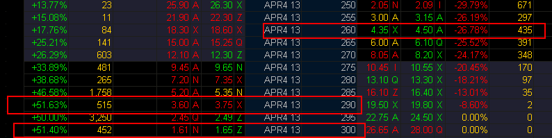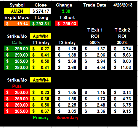 Tip: The best time to catch a White Whale is the day after an earnings release. Here are the options and prices for AMZN on 4/25/13: