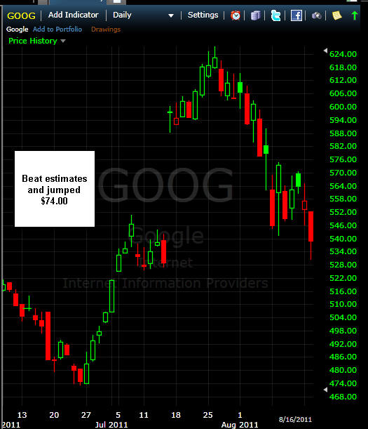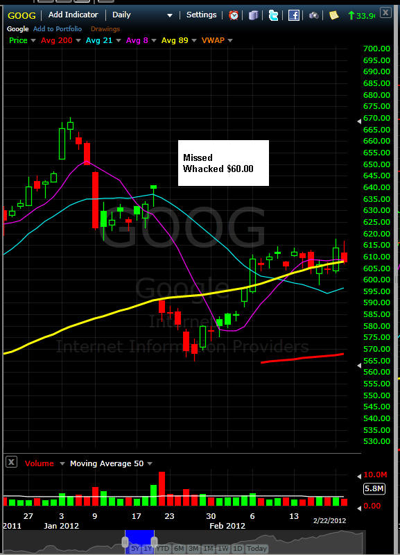 It's better to accumulate profits vs. swinging for the fence on a single trade because there is ALWAYS another White Whale trade coming; and if you keep building your account; then eventually you can scale up your contract size, and one day, you will be able to buy 100 or more contracts and make enough profit to by a Mansion and a Yacht...lol! Here is a classic example of what I am teaching you: On 4/18/13, GOOG reported earnings that beat estimates but sales missed forecasts. This initially had the stock rally nearly $30 in post market trading; however, the stock was giving almost all of it back in pre-market trading the next day.