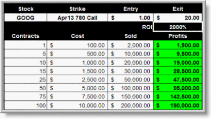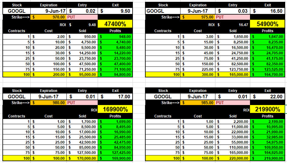 Session 5 — How to manage your filled White Whale orders. Getting filled on these trades is exciting because you know, from my past experience, you have a very high probability of making a lot of profit. The challenge is how much profit do you take? Obviously, you cannot get every high-of-the-day, and if you are still OTM, any profits you think you have can be wiped out in literally in seconds, so you have to have orders in at a pre-determined amount of profit you want to make and stick to it for 90% of your contracts. REMEMBER: You cannot go broke making profits, but if you want to be a hog, then you WILL get slaughtered—eventually. Once you have profits on multiple contradicts, take some and let the rest ride rather than try to milk every trade for maximum profits, It is much better to accumulate and increase your contract size on future trades—the goal is to build up to 100 contracts so you can literally have a MILLION DOLLAR DAY in the future! When you have OTM options, these are the ones that explode into the multi-thousand percent ROI; however, you are NOT guaranteed a fill if you have more than 10 contracts. There has to be a buyer on the other side of your transaction, so it can get frustrating if you have 50 or more. Plus, if the stock moves down sharply, the profits you think you have can and will be wiped out in seconds so taking profits on OTM is crucial. I like to stack my exit orders as the stock is moving up because that is when you have the best chance of getting filled. You see, most investors do not anticipate or predict price movement, they react to it. If the stock is moving higher rapidly, then investors love to buy the OTM options and hit the buy button with market orders, so if you are already in line with offers, then you get filled. If you have all your contracts up for sale at a single price, you may not get filled on all of them so stagger your orders for the best exit opportunities. Session 6 — How to compound your trades for massive profits! Once you start building your trading account using this strategy, you want to obviously make more money. DO NOT make the mistake of buying a lot of contracts on one strike or stock. Spread your orders on multiple stocks and strikes to increase your overall odds of success. The best part about trading options is that it is scalable. There are only capital limits to the amount of contracts you can buy so build up your capital and increase your profits with more contracts. This spreadsheet shows you the power of compounding multiple stocks and strikes with just 1 contract!