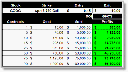 Over the years, I have learned that when a stock gets wiped out on bad news or takes off on good news, it tends to move on average 10%, but if the news is a surprise, the move up can be +20%, but the move down, well, that can be over 50% like LNKD before MSFT bought them out. When I look for Lotto puts, I like to make sure I buy the options above the major moving averages that are within a 10% move because that gives me the best odds of being ITM and guarantees me a fill when I want to sell. When a stock takes off, they typically go up around 10%, so you want your option strikes to be just under that to have the best probability of being ITM as well. Depending on the price of the stock you are trading, these options are typically cheap ($0.10 cents to $0.25 cents per contract) because they are pretty far OTM, so you are not spending a lot of money to get into these Lotto Trades; however, most of the time, they will expire worthless, but when they do pay off, you are making a boat load of money that can easily cover all the losses you took on the ones that do not work out. Some of my best picks that tuned into massive Lotto and Moby Dick Mega Lotto winners were on: GOOG, AAPL, PCLN, NFLX, ISRG, META, CMG, LNKD (before they were bought out by MSFT) and GLD for a whopping 30,000% gain in two days...WOW.