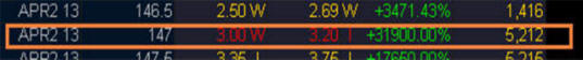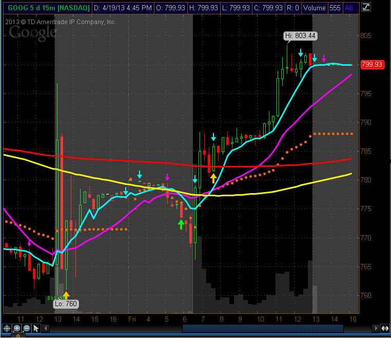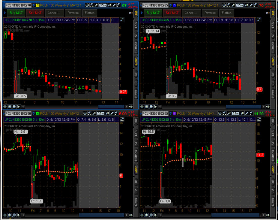 Because GOOG was about to get crushed, the OTM call options were also getting crushed at the open giving some lucky investors a perfect opportunity to buy those calls on the cheap...real cheap! As you can see, the day before at the close, the APR13 790 calls were trading at $8.50 and by the open they were as low as $0.10 CENTS. Also the APR13 780 Calls were trading for $14.00 and they opened at $0.70 CENTS!! By the end of trading, both of these strike prices made a fortune for you when GOOG took off in the afternoon session closing right at the expected move of $800; which was a $33.00 move as predicted by the TOS platform the day before!