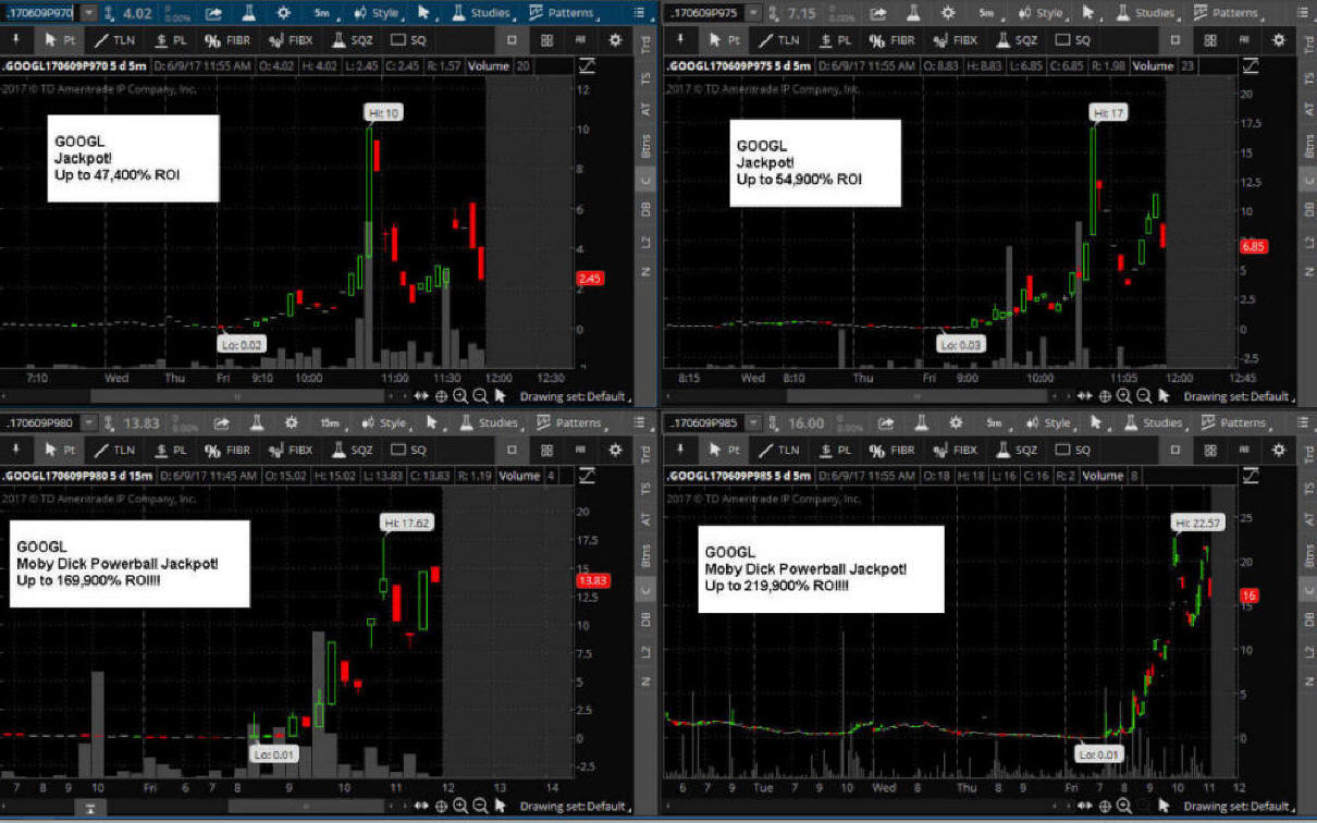 Session 2 — How to make your Lotto and White Whale Nets For many years I would hunt and search for option trades that could make me hundreds of percentage points in returns (%ROI); however, those trades are nothing compared to the massive winners I stumbled onto with fishing orders that opened my eyes to this type of trading strategy. I call them White Whale or Lotto Trades because these types of trades literally make you THOUSANDS of percentage points in profits—and typically the very next day!! Just look at the bottom of this page you will see some of my massive winners I have posted to this site over the years before they happened!