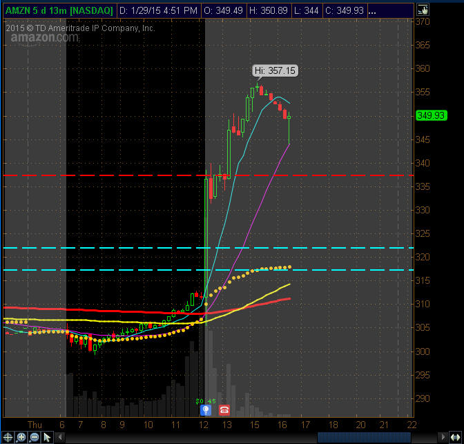 The hard part is figuring out what strike price's to buy, because if you are not inside the range of the stocks movement for that day, then you will have a hard time getting filled when you want to sell—unless there is a large amount of volume. So, how do you figure that out? Well, for many years, that information was not readily available to retail investors. In fact, you needed to have complex mathematical skills or access to powerful trading computers to crunch the numbers, but thanks to increasing technology, a master trader/market maker (Tom Sosnoff) developed his own platform to do the hard math instantly! Today, that platform is offered by TD Ameritrade and is named: With TOS, you can do many complex analytical calculations instantly to help you determine the best statistical probabilities that can make your trades more profitable. When it comes to finding option prices to catch the White Whale, they have a very cool indicator that shows you the mathematical expected move a stock can make up or down the next day. Here is an example: On April 25, 2013, AMZN was reporting earnings and the expected Market Maker Move (MMM) calculates a +/- $19.14 move: