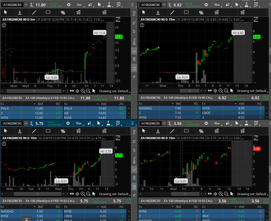 Ok, if you want to have the best possible chance to make multi-thousands of percent in profits, then what you are hoping for is a big move in both directions in after hours or pre-market trading the next day, that way, the premium gets crushed and you can get a fill at dirt cheap prices; however, you must have standing orders the day before or in the pre-market because it's very difficult to buy a lot of contracts in the first few minutes of trading if you are manually doing it. If you are in line the day before, then you have a higher chance the computer will "auto-fill" you on some or all of your contracts at a better price. The reason for this is because traders who bought the night before are getting crushed in the morning and stop orders are becoming market orders. When you have your pre-market LIMIT orders sitting there, you stand ready to pick up all those investors options who are getting out or panicking taking anything they can get—you are the liquidity provider! The markets are almost 100% electronic, so what the computers are looking for in the first seconds of the opening is standing orders to buy. This is why options get whacked in early trading. The prices fall until the computers find liquidity providers—and you want to be FIRST IN LINE—so put your orders in the night before or a half hour before the market opens...first come first served! If you are trying to buy more than 10 contracts, then you have to send in multiple orders and staggered LIMIT prices. NEVER USE MARKET ORDERS WHEN YOU BUY! Picking the correct strike prices is an art, so you have to be a bit of a detective. We want to listen to the conference calls and read the after market commentaries to gauge the bias for the next day. If the stock blows out the numbers and guides higher, then typically the stock will bounce around in post and pre-markets. What we want for CALL plays is the stock to initially open down crushing the premium and/or triggering stop orders; and then giving us a super cheap fill. Once the first few minutes of trading are settled, we want the stock to catch a bid and start the climb higher rapidly pumping up the implied volatility giving us bigger profits!