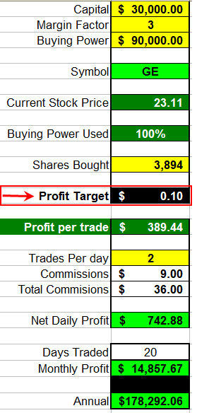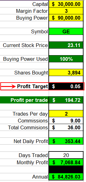 As you can see, the movements are predictable and consistent so you can easily get your $0.05 - $0.10 cents a day trading GE. The best way to trade this stock is wait for the topping or bottoming tails to show in the first 30 minutes of the trading day and then work your way in the direction of the market to capture your profit. GE will follow the overall direction of the Dow Jones 30 ($DJI) better than 90% of the time. So if the market is up, then GE will be up and vice versa—by working with a larger time-frame, you will be able to make consistent gains every day without a lot of stress or risk. Ok, let's do some math and see just how profitable this can be for you to build your nets with. Taking into consideration you have a $30,000 trading account, you can buy (based on 3:1 margin) up to 3,894 shares; however, in the beginning, I strongly recommend you start with 1000 shares until you are familiar with this stock and your abilities, then you can go with 3000-4000 shares per trade—remember, your target profit is between $0.05 - $0.10 cents per trade. Once you get good at trading this stock, you can typically catch 2 - 3 trades a day if the stock is making moves and some days, GE will trade pretty much flat all day; while other days, it will move well over $0.35-$0.75 cents, so do not get greedy and force trades because there will be plenty of opportunities throughout the week to make your Lotto Trade money—trading this way is not a sprint...it's a marathon! Below are two examples of the possibilities making two trades a day: