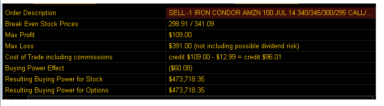 =========================================================================================================== 7/14/14 - Another big day of trading in AMZN showing the bulls are all in as the stock raced past the 200MA climbing all day and closing at its high. Now all it has to do is get past the SGB zone and off to the races for new all time highs if earnings are good. Now that we have a major moving average as support, that is the battle ground going forward. I sold my Bull Call Spread for a nice profit today. I still have the Iron Condor on and will close out the