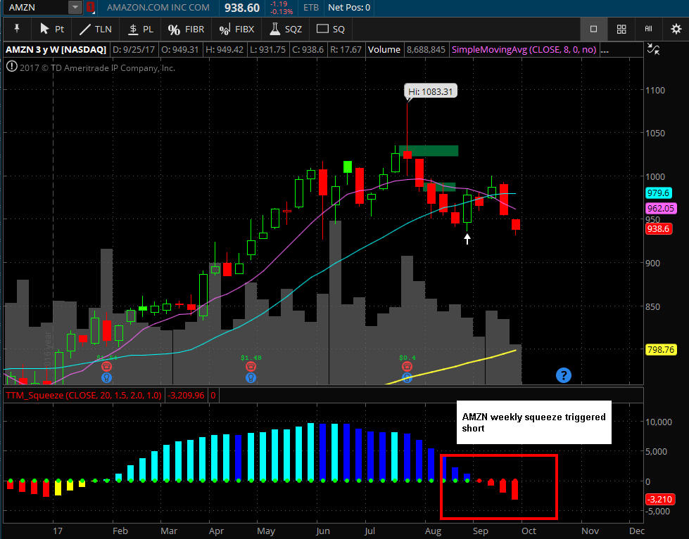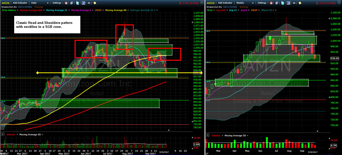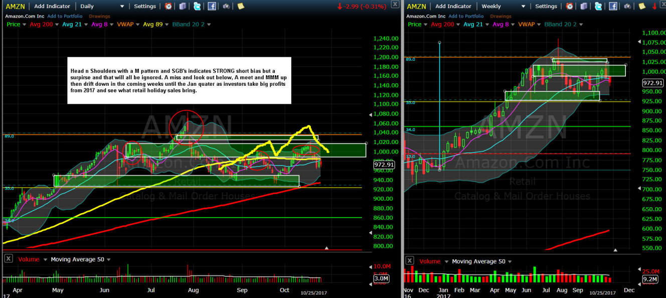 ========================================================================================================================== 9/25/17 - Ah yes, the behemoth is about to speak to us tomorrow; and if they do not surprise; then that nice H&S pattern will have the Bears coming out of hibernation with a consensus of "sell the news", but if they do surprise, well, the Bulls will open a bottle of Head & Shoulders; and then brush off the Bears like they were just some dandruff bothering them. For me the clues to a massive move are the SGB zones on the left shoulder and now the recent ones on right. The challenge with playing AMZN is the cost so here is what I plan to do this time. I will be selling a new twist on an Iron Condor credit spread (ICU) for the upside pin at or near $1,000 and then buying some lotto puts on the down side in hopes they get CRUSHED like CMG was today.