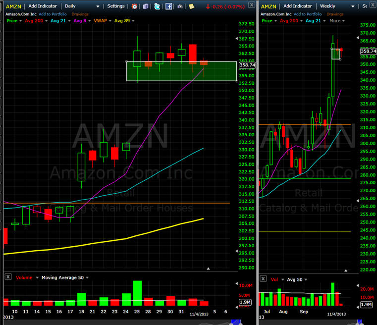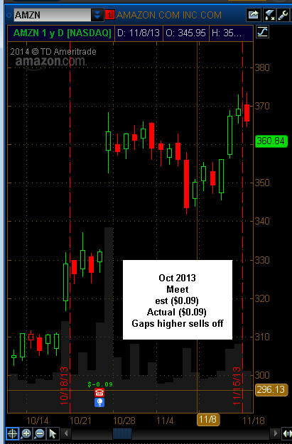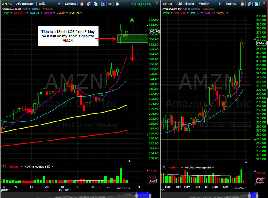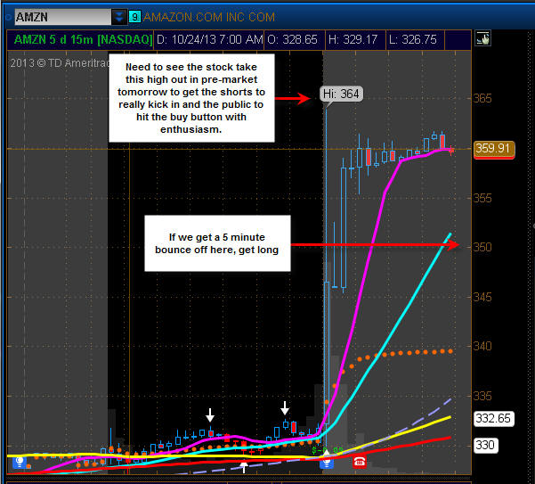 10/21/13 - Nice move today ahead of earnings tomorrow. Chart pattern suggests AMZN will head higher but we have seen what NFLX did on a beat. Tough one to call on this one but I have the calls and will pick up some $305 puts tomorrow. ================================================================================================ 10/21/13 - Can AMZN get a pass again and again on earnings misses? Looking at the daily chart today, you would already think they announced earnings and gapped up. Well, the big question for me is if investors have any money left to spend on AMZN. With CMG, GOOG, NFLX and soon AAPL, I am not so sure AMZN will have a huge move. If we see GOOG and CMG getting dumped tomorrow, then we should be on for a solid move in AMZN. If CMG, GOOG, NFLX and AAPL all power higher, it's going to take a solid beat to lift AMZN this time in my estimation. I remember last time, the stock took off and then pulled back the next day only to be short squeezed mercilessly all day back over $300 a share. This time, will be ready after earnings are announced.