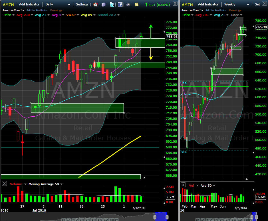 ============================================================================================================================================= 8/7/16 - Since my last comments, AMZN had their earnings release and once again beat. The stock saw much smaller move than last earnings, and put in a SGB that has been tested and now taken out on Friday. We have the pivot point for Long and Short plays so for now, the bias is long if the stock opens up tomorrow and holds above $764.00. My strategy is to sell some Naked Puts or Bull Put Spreads and I want to fish for some Butterfly spreads for this Friday expiration.