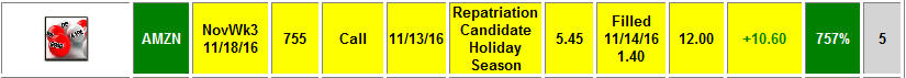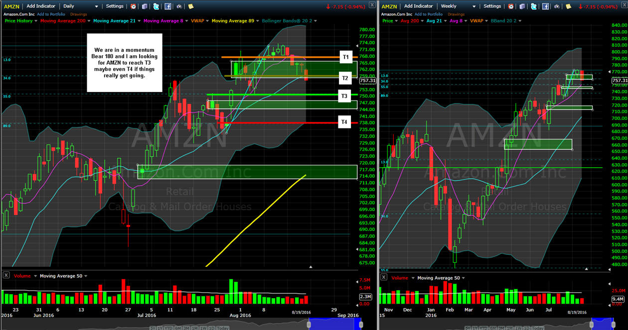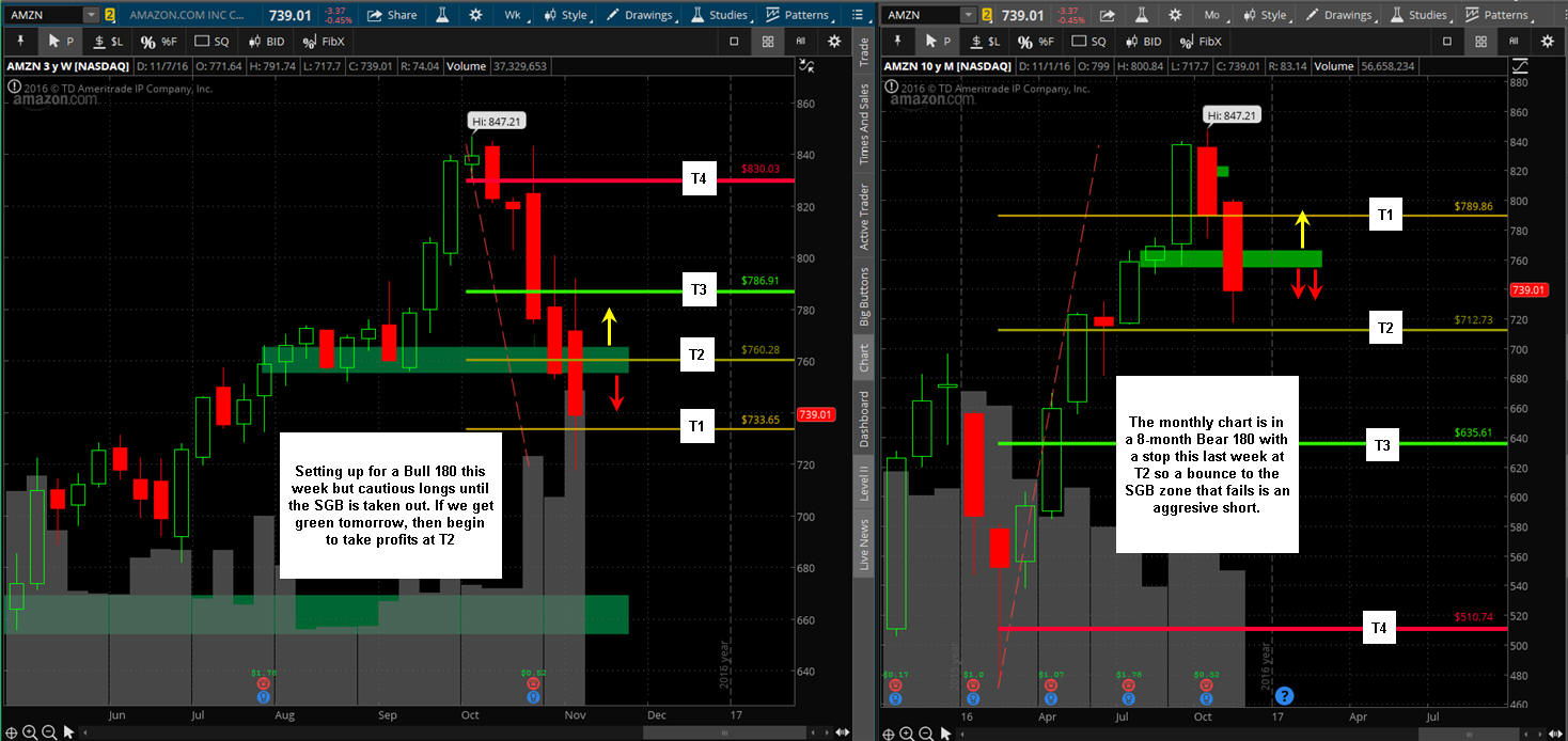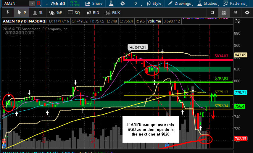 ======================================================================================================================================================= 11/17/16 - Looks like inventors believe AMZN will benefit from a Trump administration has drove the stock higher all week so far with a stop today at the SGB zone. Tomorrow should be an interesting day so I am going to do some WW fishing on the 765 Calls if bullish sentiment in pre-market and the 740 puts if bearish. On the weekly chart, we have a triggered Bull 180 in play and upside to $800 per share so I am going to put on some spreads and butterflies for next week and beyond. Long term comments all week that AMZN is a great bullish play and there certainly is plenty of upside to recover but you never know what is going to happen with the rival between Bezos and Trump, but I am thinking it will be worked out—there is just too many Billions on the line for Bezos not to tone down on Trump...initially.