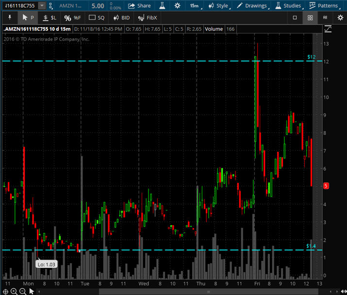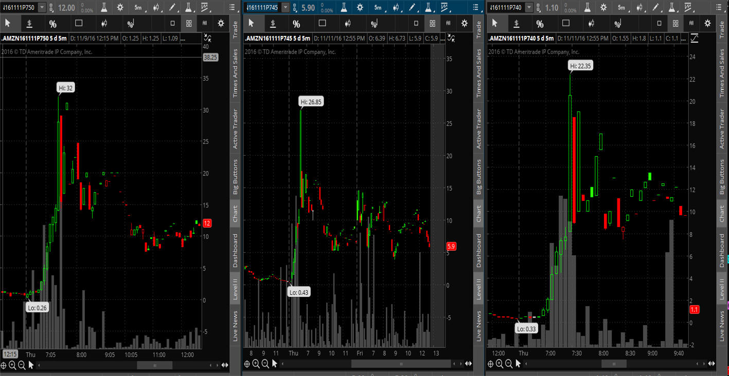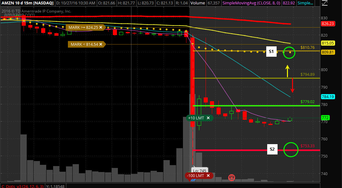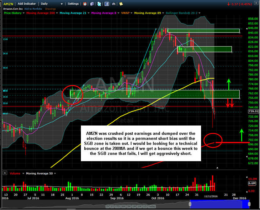 ============================================================================================================================= 11/13/16 - WOW what a deluge of selling AMZN has been under since the earnings miss; and now with the Trump upset, this stock was hammered even more post elections. I am sure it was due to the fact that CEO Bezos and Trump were basically bitter enemies; and now that Trump has won the election fund managers are definitely worried that Trump will have a grudge against AMZN based on his anti-trust comments. Donald Trump said Amazon and Jeff Bezos have a ‘huge antitrust problem.’ Now they may.The president-elect is certainly one to hold grudges.Bezos did offer a congratulatory tweet (Congratulations to @realDonaldTrump. I for one give him my most open mind and wish him great success in his service to the country.) to Trump, so maybe things will work out between them in the coming future, but if we get the aggressive outspoken Trump, then you can expect a lot of volatility in AMZN in the coming months. Here is what happened to Puts on AMZN Thursday when the Dow rallied but the Nasdaq stocks were crushed. If you were WW fishing then you had the chance to catch a Moby Dick, so study these charts, learn the strategy and start your fishing trips every week because I am sure there will be plenty of volatility in AMZN going forward. Start fishing on Wed-Fri every week on AMZN and FB even if I do not have trade ideas posted. Looking over the charts below, we have some good insight on the bias for AMZN and some solid SGB pivot points to trade off of.